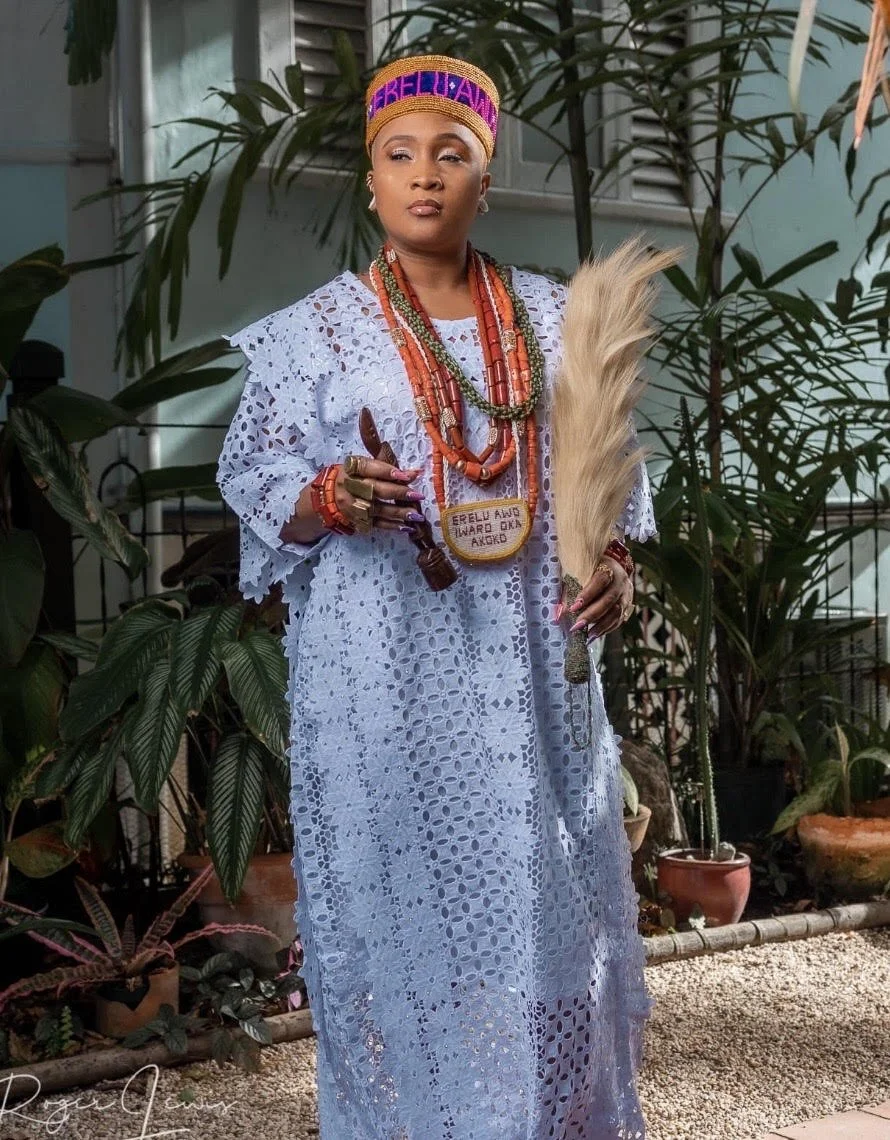 Dr. Natalya Mills, a distinguished native of Trinidad & Tobago, has been crowned and appointed as the Èrèlú Awo of Iwaro Oka Àkókó in Ondo State, Nigeria. She collaborates with His Royal Majesty, Oba Akande Omiyejola, the Asin of Okà Land. Natalya Mills, who also bears the names Ifáfunmilayo Eégúnniwura, is a mother, Ìyánifa (female Ifá priest), Ìyá Oje (Eégúngún/ancestor Priestess), and artist- philosopher. Her expertise spans art philosophy, curatorial, Caribbean culture, dress and costume history, identity, Yorùbá cosmology, and Black Body Politics. Her scholarly contributions intricately weave together elements of Yorùbá culture with Caribbean philosophy, Trinidad Carnival arts, and Caribbean history. She serves as the Spiritual Head and Iyanifa of Ile Ijosin Ifá Otito Ile Aye Temple in New York City, a spiritual and cultural institution devoted to helping children of the African diaspora remember and reclaim their West African identity. In 2024, Dr. Natalya Mills founded IOIA Inc., a 501(c)(3) organization, where she serves as Founder and Executive Director. The organization was created to address a clear gap in the fine arts sector and is dedicated to preserving African diasporic creative expression through the advancement of ancestral methodologies. She has also been appointed Secretary General of the U.S. Branch of the International Council of Ifa Religion (ICIR USA).